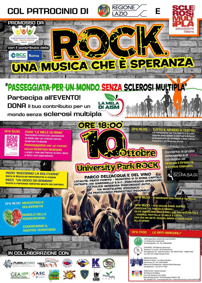 Un quartiere di ultraperiferia, troppo spesso dimenticato e negato anche da chi ci vive, cerca di riprendere sè stesso: Prato Fiorito, nel Sesto Municipio di Roma Capitale, il prossimo 10 ottobre vivrà una giornata da godere tutti insieme partecipando all’iniziativa “Rock – una musica che è speranza”, promossa dalla associazione Pro Prato Fiorito e patrocinata dalla Regione Lazio e dalla Associazione Italiana Sclerosi Multipla. Dalle 10 di mattina fino a oltre le 23 sono previste passeggiate, gare di bocce, giochi per i più piccoli, esibizioni di gruppi musicali, letture teatrali, balli di gruppo e dimostrazioni di arti marziali come la Muay Thai (a cura della palestra As Le Arti di Colle Prenestino del maestro Roberto Caporuscio). Verranno inoltre raccolti fondi da destinare alla ricerca sulla sclerosi multipla.