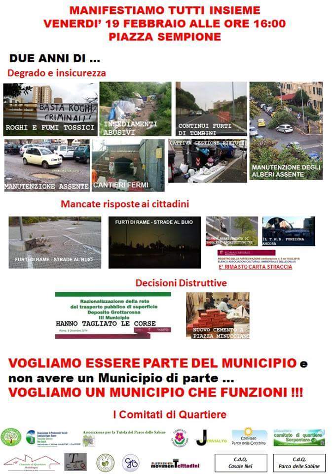 amministrazione municipale, accusata di inerzia e immobilismo davanti ai problemi del territorio ripetutamente esposti nelle assemblee: manutenzione e cura del verde assenti, furti di rame con conseguente oscurità che avvolge le strade, barriere architettoniche, nuovo cemento a piazza Minucciano, impianto Ama Salaria, furti di tombini, roghi e fumi tossici, cantieri fermi, mancata creazione del registro della partecipazione, trasporto pubblico inadeguato. Hanno dato conferma della propria presenza come si deduce dalla locandina: Comitato Jonio Cervialto, Amici Parco delle Valli, Comitato Parco delle Sabine Comitato Vigne Nuove, Associazione tutela del Parco delle Sabine, Settebagni, Talenti, Casale Nei, Parco della Cecchina, Serpentara, Comitato Le Valli Conca d’Oro, Movimento Cittadini, Comunione Prati Verdi della Bufalotta.