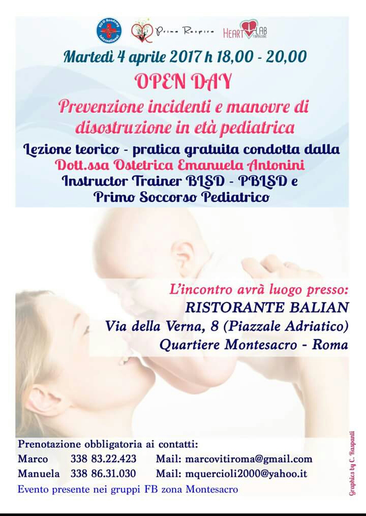 sapesse come operare in questi casi. Per questo motivo è stata organizzata per il prossimo 4 aprile una lezione teorica e pratica GRATUITA di tecniche di disostruzione in età pediatrica e prevenzione di incidenti che si terrà presso il ristorante Balian in via della Verna 8 (nei pressi di piazzale Adriatico a Monte Sacro) dalle 18 alle 20. La lezione – che prevede l’ ausilio di manichini – sarà tenuta dalla dottoressa ostetrica Emanuela Antonini che è anche instructor trainer Blsd – Pblsd (Pediatric Basic Life Support – Defibrillation) e Primo Soccorso Pediatrico. Sarà rilasciato attestato di partecipazione. I posti sono limitati per garantire un apprendimento efficace e per questo verranno accettate le prime sessanta adesioni, inserendo quelle in sovrannumero in successivi appuntamenti. Per aderire inviare mail a marcovitiroma@gmail.com oppure mquercioli2000@yahoo.it indicando nome cognome e telefono oppure chiamando i numeri 338 8322423 e 338 8631030.