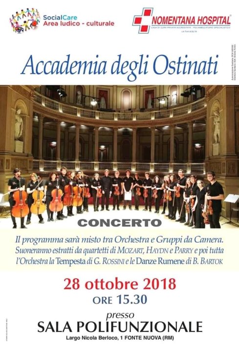 [Fonte Nuova] Appuntamento musicale di notevole spessore il prossimo 28 ottobre presso la sala Polifunzionale del Nomentana Hospital di Tor Lupara: per il secondo anno suoneranno per i degenti i giovanissimi allievi della scuola di musica “Accademia degli Ostinati” di Roma, già vincitori del “Premio Montesacro” . Il programma è misto tra gruppi da camera e Orchestra: verranno eseguite composizioni di Mozart, Haydn, Parry, Rossini e Bartok. Inizio previsto per le 15 e 30, ingresso libero.