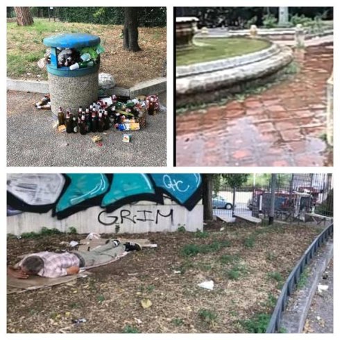 [Roma] Le immagini che vedete ritraggono le condizioni del parco Caio Sicinio Belluto, a due passi da piazza Sempione nel cuore storico di Monte Sacro. Sono recentissime, pubblicate in rete la mattina del 23 agosto da Giordana Petrella, capogruppo di Fratelli d’Italia in Terzo Municipio. In sintesi: una persona riversa a terra in una aiola dorme sui cartoni smaltendo presumibilmente i postumi di una sbronza clamorosa, l’acqua della fontana trabocca scorrendole attorno, ai piedi di un bidone della spazzatura ricolmo sono state lasciate le bottiglie di birra vuote che non vi hanno trovato posto. <A quanto pare il “Modello Montesacro”, baluardo della giunta municipale di centro sinistra, è da rivedere> commenta Giordana Petrella.