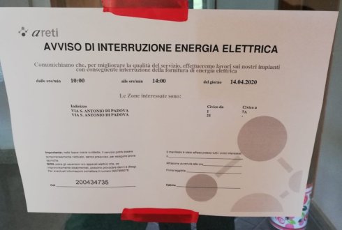 [ROMA] Sono stati affissi degli avvisi da parte della Areti che avvisano di un nuovo distacco della corrente per lavori in via Sant’Antonio di Padova, quartiere Settebagni. I numeri civici interessati- si legge sul volantino- sono quelli dal’1 al 7A e il comprensorio al civico 24. L’interruzione è prevista dalle 10 alle 14.