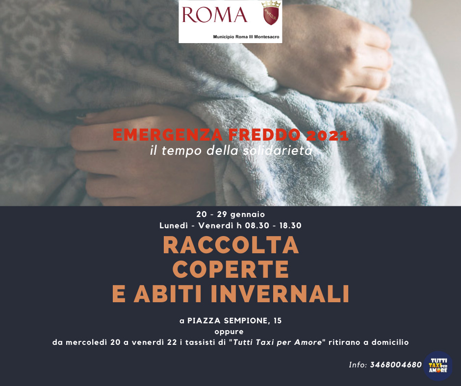 [ROMA] Fino al 29 gennaio – tranne sabato e domenica- si possono portare nella sede del III Municipio a piazza Sempione delle coperte e abiti invernali da distribuire a chi si trovi in condizioni di indigenza e costretto a trascorrere all’addiaccio le gelide notti invernali. Il punto di raccolta è attivo dalle 8 e 30 alle 18 e 30. Della successiva distribuzione si occuperanno associazioni di volontariato. L’invito è rivolto non solo ai privati cittadini ma anche a negozi e lavanderie per quanto riguarda merce invenduta o giacenze. Inoltre fino al 22 gennaio è possibile chiedere ai tassisti di “Tutti taxi per amore” il ritiro a domicilio (telefonare al 3468004680). Si raccomanda che le coperte e gli abiti siano nuovi o in buono stato, puliti e in busta chiusa.