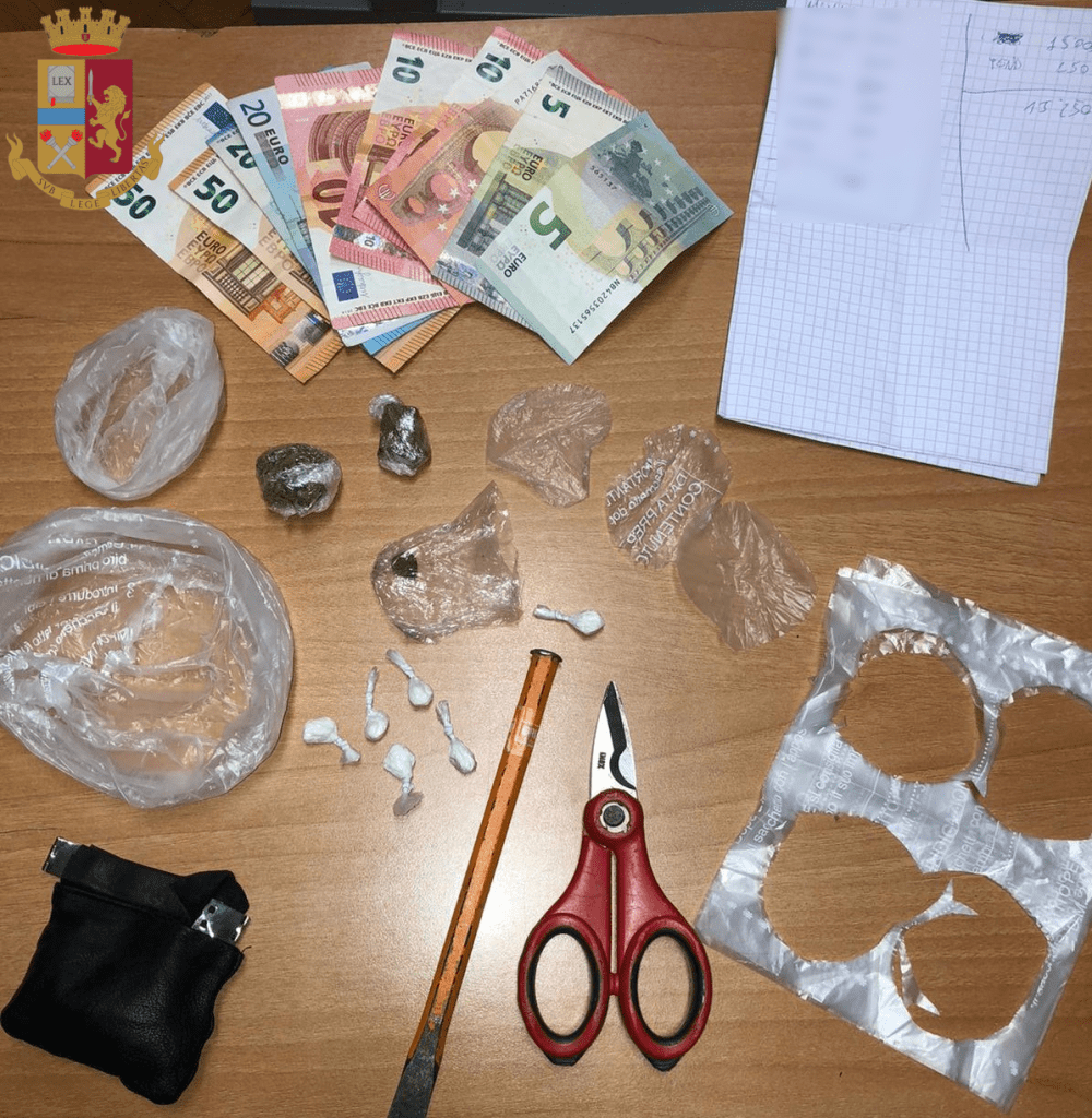 Una volta bloccato è stato perquisito e trovato con 190 euro in contanti mentre in auto aveva quasi tre grammi di cocaina, 5,40 grammi di hashish e 2,30 grammi di marijuana. In casa gli sono stati trovati0,80 grammi di hashish e un foglio di carta con nomi e cifre.