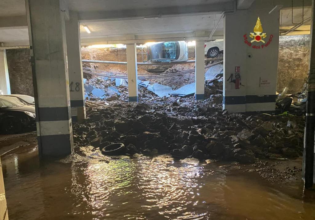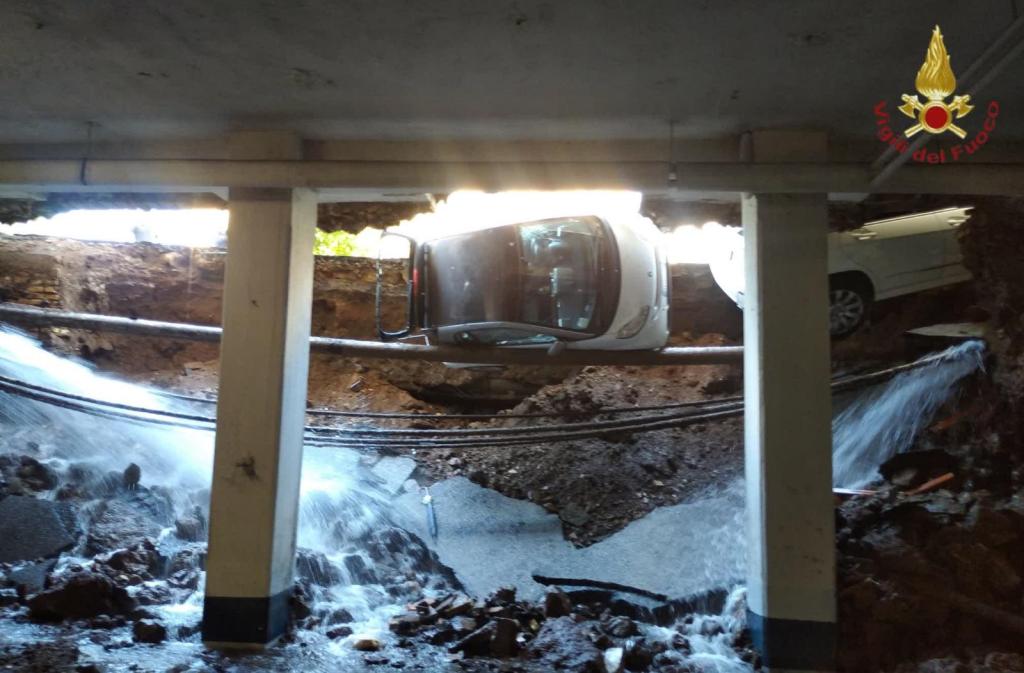 Le due vetture, una Smart e un Suv, sono sprofondate nel garage sottostante una palazzina. Ci sono stati anche danni alle condotte della rete idrica. Sul posto sono intervenuti i Vigili del Fuoco oltre al personale Italgas e Acea.