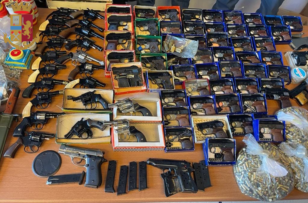 Il materiale trovato in casa era costituito da una pistola calibro 7,65 con la matricola abrasa e circa duemila cartucce, una paletta contraffatta con la scritta Polizia di Stato, una baionetta da punta e taglio mentre in un locale di pertinenza nello stesso palazzo c’erano nove pistole lanciarazzi modificate e quindi idonee all’esplosione di colpi di arma da fuoco; 182 pistole lanciarazzi; circa 40 kg. di materiale pirotecnico e alcune bombe carta, alcune armi bianche e un piede di porco.