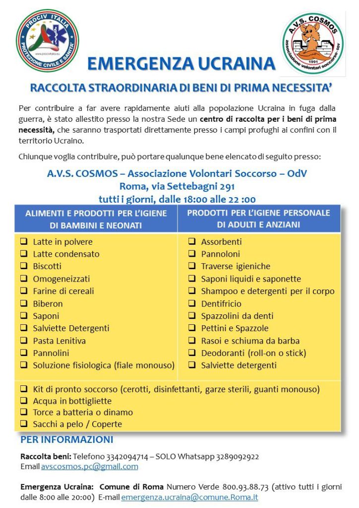 [ROMA] L’associazione di Volontariato di Protezione Civile AVS COSMOS – Associazione Volontari Soccorso OdV, in collaborazione con il Coordinamento Nazionale di Protezione Civile PROCIV ITALIA sta organizzando una raccolta di beni materiali da destinare e portare direttamente in loco per le popolazioni in fuga dai territori ucraini.