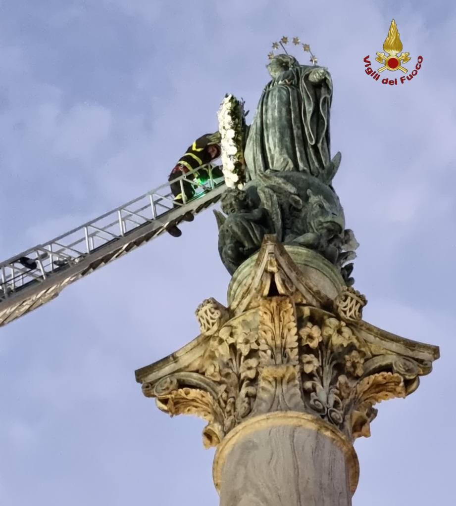 Si è rinnovata ancora una volta quindi la tradizione che vede i pompieri della Capitale lasciare tra le braccia della Madonna un omaggio floreale dopo una scalata di trenta metri.