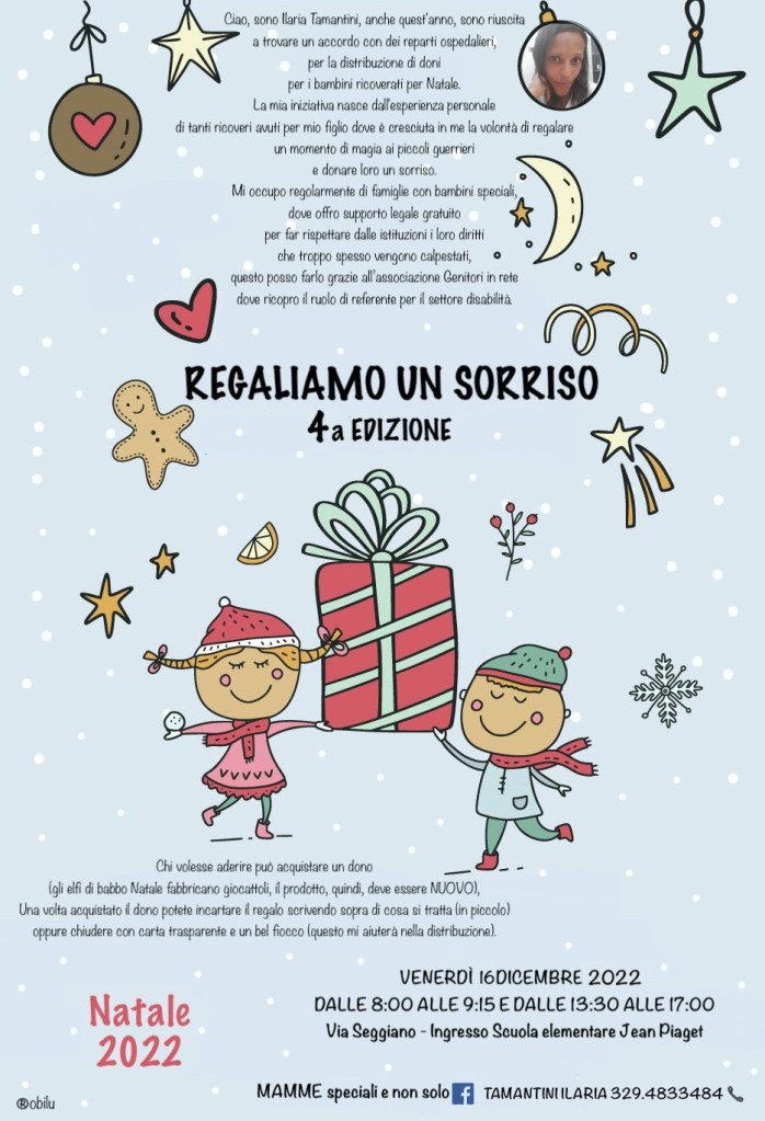 È giunta alla quarta edizione “Regaliamo un sorriso”, l’iniziativa di Ilaria Tamantini – mamma che ha vissuto molteplici ricoveri ospedalieri pediatrici – volta a portare giocattoli in dono ai piccoli pazienti ricoverati durante il periodo di Natale. Chi volesse aderire potrà portare un gioco nuovo – incartato con carta trasparente e fiocco oppure incartato con carta regalo tradizionale ma usando l’accortezza di segnalare in piccolo, in un angolo, il tipo di gioco e l’età di riferimento – il giorno 16 dicembre, dalle ore 8 alle 9,15 o dalle 13,30 alle 17 all’ingresso di via Seggiano della scuola Jean Piaget. Per ulteriori …informazioni: Ilaria Tamantini 329/48.33.484