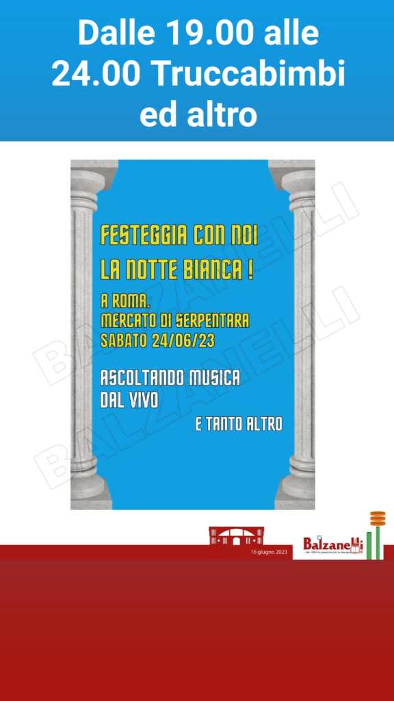 [ROMA] Una notte bianca, non si musei ma al mercato Serpentara di via Talli: è quella che si svolgerà sabato 24 giugno. Sono previsti musica e iniziative per bambini in modo da fare diventare il mercato una piazza estiva per quartieri dove scarseggiano le iniziative culturali e di socialità legate alla stagione calda.