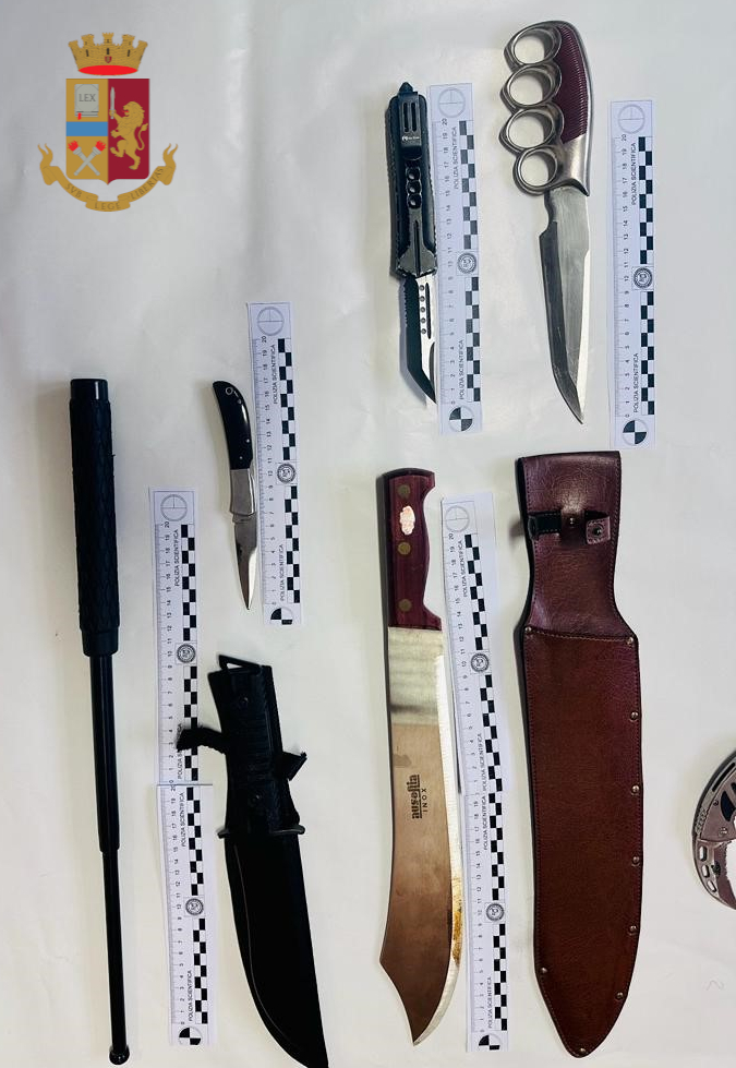 Tra gli oggetti sequestrati c’erano quattro fucili di cui uno a canne mozze, quattro pistole, tre tira pugni di cui uno dotato di taser elettrico, diverse confezioni per il munizionamento e tredici armi bianche tra pugnali e coltelli ed un machete.