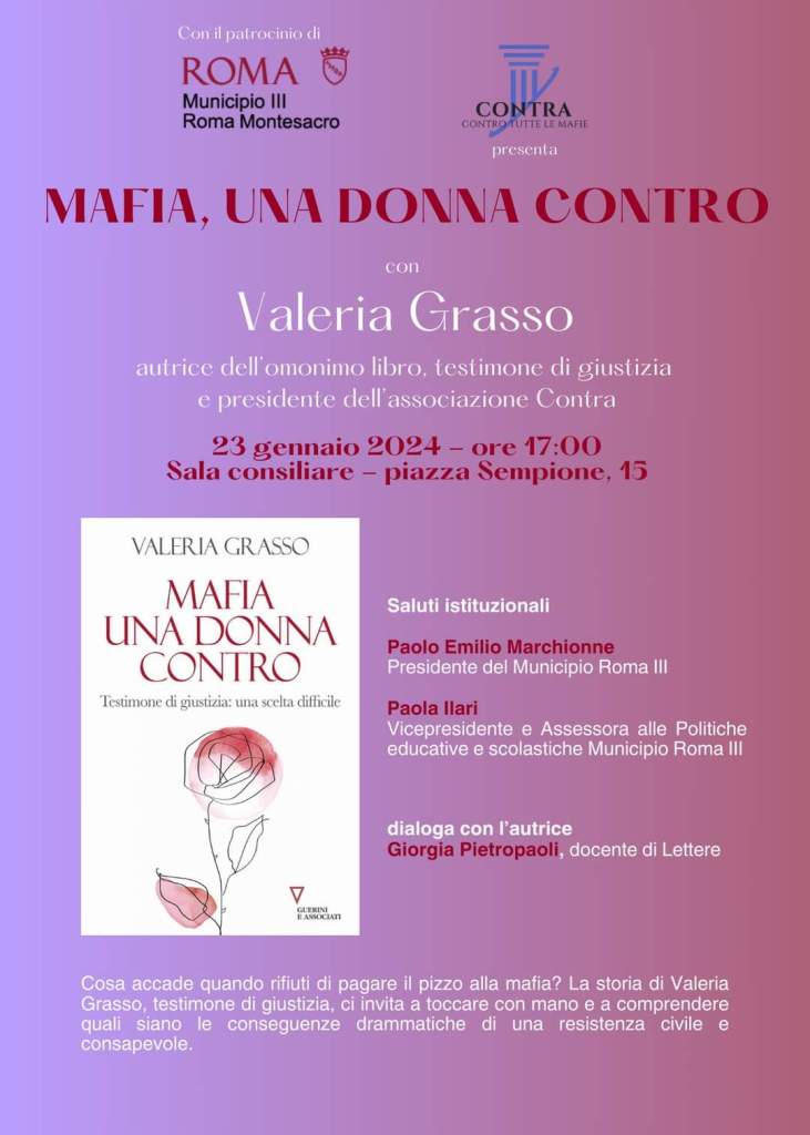 [ROMA] Cosa accade quando si rifiuta di sottomettersi alla mafia che pretende il pizzo? Se ne parlerà martedì 23 gennaio 2024 nell’aula consiliare di piazza Sempione con Valeria Grasso, testimone di giustizia e presidente dell’Associazione “Contra – Contro tutte le mafie”, autrice del libro “Mafia, una donna contro. Testimone di giustizia: una scelta difficile“, edito da Guerini e Associati.