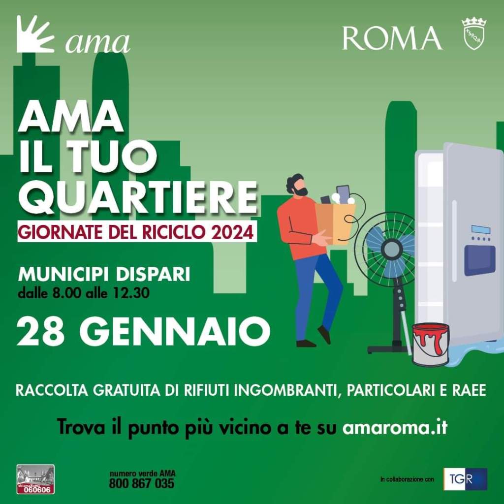 [ROMA] Torna domenica 28 gennaio 2024 nei municipi dispari l’iniziativa AMAilTuoQuartiere – Giornate del Riciclo, organizzata da AMA in collaborazione col Tgr Lazio. Verranno allestite postazioni straordinarie, oltre ai consueti Centri di raccolta, per incentivare la raccolta differenziata gratuita dei rifiuti urbani, ingombranti, elettrici ed elettronici. In particolare ci si potrà disfare di legno, metallo, ingombranti, frigoriferi e condizionatori, grandi elettrodomestici, monitor e televisori, apparati elettronici, lampade al neon, batterie al piombo, consumabili da stampa e in alcuni punti contenitori di vernici e solventi. L’orario della raccolta è dalle 8 alle 12 e 30.