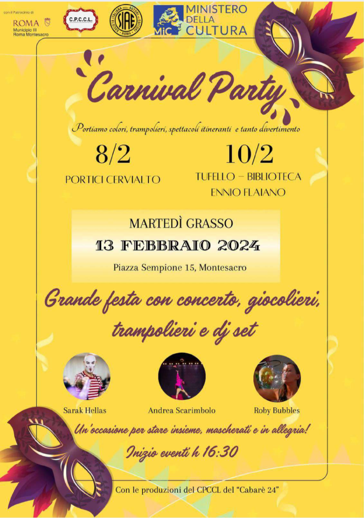 [ROMA] Una grande festa con concerto, giocolieri, trampolieri e dj set: è il programma di “Carnival Party”, manifestazione che si terrà giovedì 8, sabato 10 e martedì 13 febbraio 2024 dalle ore 16 alle ore 19 presso i portici di via Monte Cervialto, la Biblioteca Ennio Flaiano di via Monte Ruggero e a piazza Sempione.