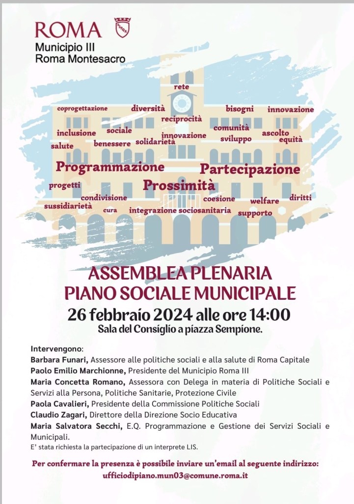 È prevista per oggi alle ore 14.00, presso la Sala Consiliare di Piazza Sempione, la convocazione dell’Assemblea Plenaria per l’avvio del Piano Sociale del Terzo Municipio 2024 – 2026. Lo scopo è quello di far emergere i bisogni e le fragilità presenti nel territorio, descrivendo gli interventi finora realizzati attraverso la collaborazione dei vari attori territoriali, quali Associazioni riconosciute, Parrocchie, Asl, Comitati di quartiere, dirigenti scolastici, Case Sociali degli Anziani e del Quartiere, Organizzazioni Sindacali, rappresentanti dei genitori e degli studenti, Associazioni del Privato Sociale, Consulte Municipali, Terzo Settore. Verranno raccolte le proposte/iniziative progettuali da discutere nei tavoli tematici previsti. L’incontro sarà un momento di presentazione e condivisione al fine di programmare servizi di prossimità mettendo insieme le forze già presenti nel sistema. Tra gli interventi previsti, quelli del Presidente del Municipio, Paolo Emilio Marchionne, dell’assessora municipale Maria Concetta Romano e dell’assessora di Roma Capitale Barbara Funari.