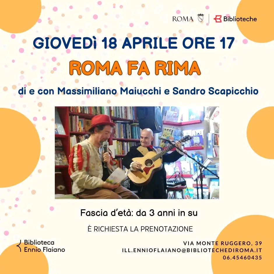 [ROMA] Alla Biblioteca Ennio Flaiano giovedì 18 aprile 2024 Massimiliano Maiucchi e Sandro Scapicchio presentano “Roma fa rima”, incontro animato per bambine e bambini dai 3 anni in su.