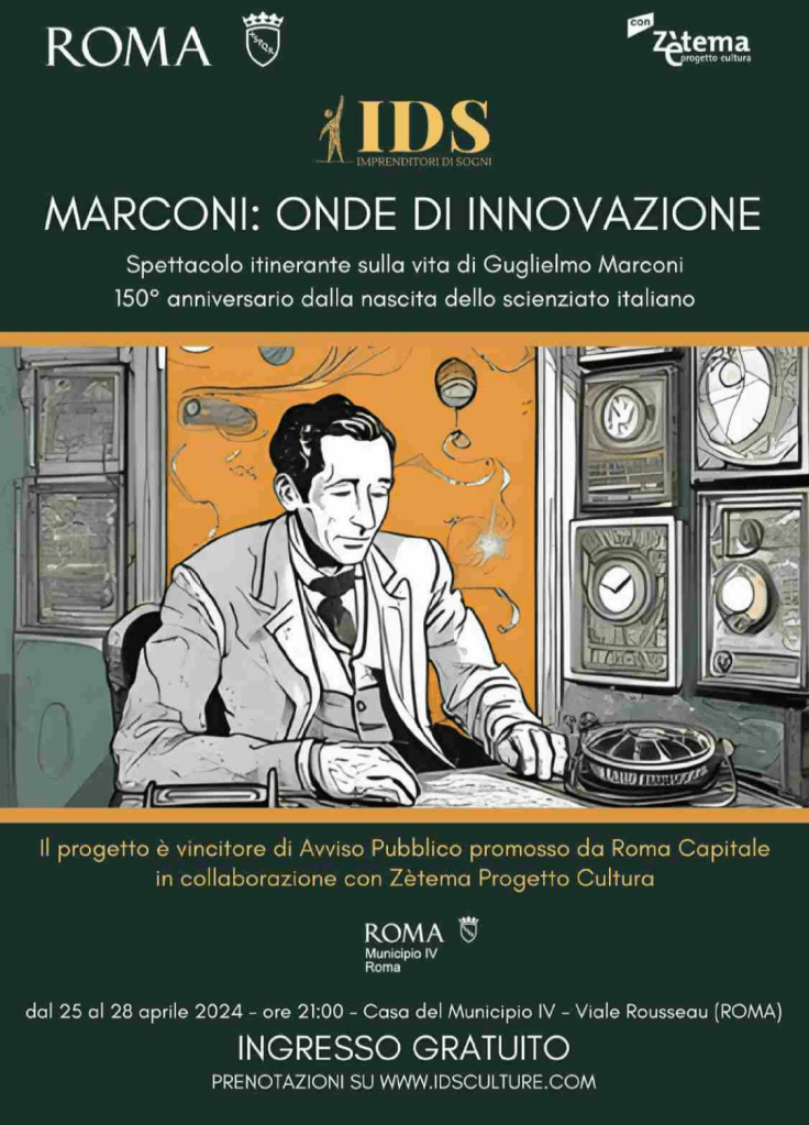 [ROMA] In onore dei 150 anni dalla nascita di Guglielmo Marconi (25 aprile 1874) il Quarto Municipio del Comune di Roma offre al pubblico lo spettacolo “Marconi: onde di innovazione”, un affascinante viaggio attraverso la vita e le realizzazioni di uno dei più grandi innovatori della storia moderna, inventore della radio e premio Nobel per la Fisica.