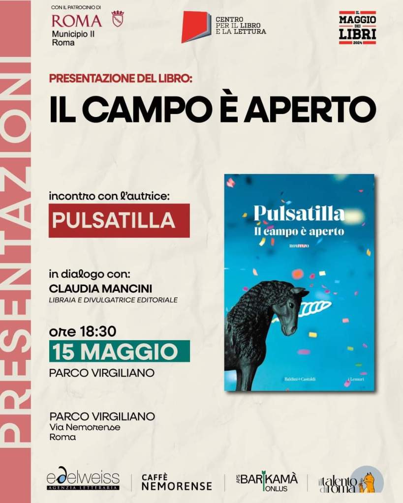 [ROMA] Mercoledì 15 maggio 2024, alle ore 18 e 30, il Parco Virgiliano di via Nemorense nell’ambito della rassegna “Maggio dei libri in Municipio II“ospita la presentazione del romanzo “Il campo è aperto”, scritto da Pulsatilla (Valeria Di Napoli) ed edito da Baldini e Castoldi