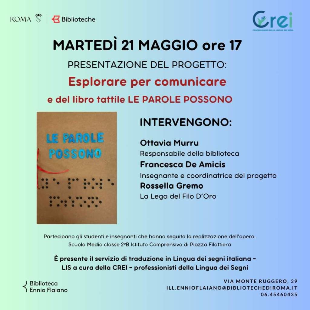 [ROMA] Martedì 21 maggio 2024 la biblioteca Ennio Flaiano presentazione del progetto ESPLORARE PER COMUNICARE e del libro tattile “Le parole possono”.