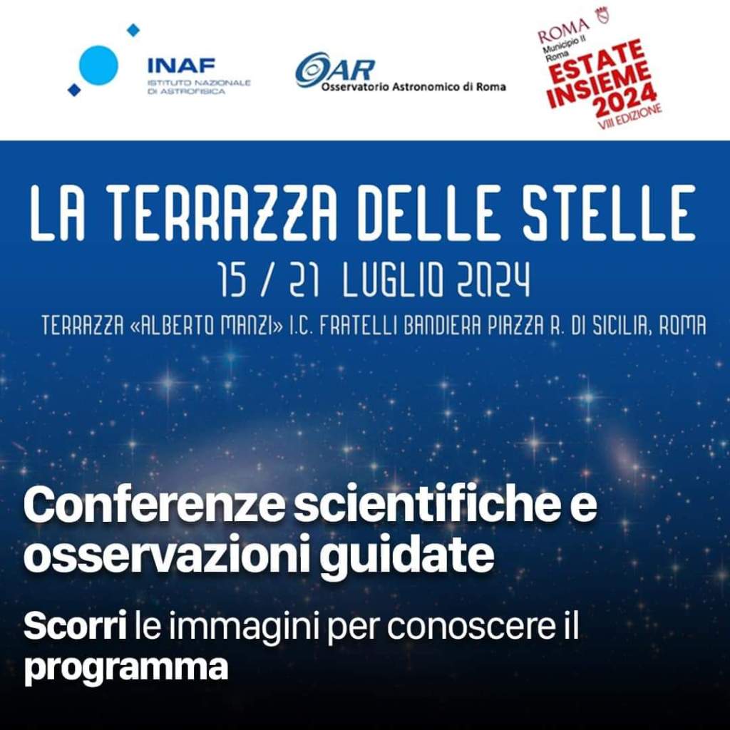 [ROMA] A partire da lunedì 15 fino a domenica 21 luglio 2024 la terrazza “Alberto Manzi” dell’istituto comprensivo “Fratelli Bandiera” sarà per una settimana un palcoscenico interamente dedicato all’astronomia e alla scienza con “La Terrazza delle Stelle”, un’iniziativa del Municipio Roma II in collaborazione con l’INAF-Osservatorio Astronomico di Roma.