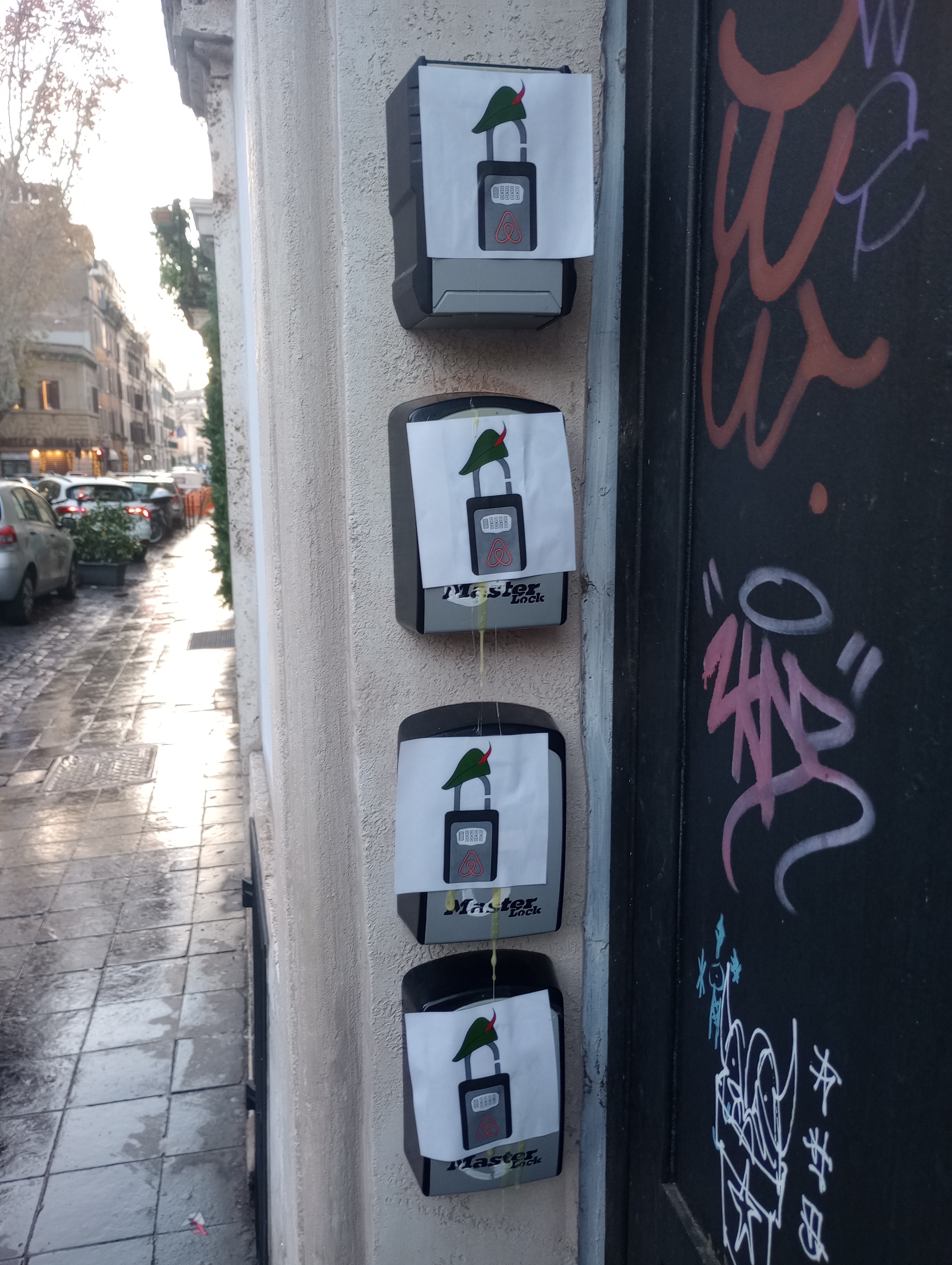 la mattina dell’11 dicembre le scatole a combinazione (“Key box”) delle quali è disseminata Trastevere e che servono ai proprietari di B&B a lasciare le chiavi di ingresso ai loro clienti (previa comunicazione riservata del codice per aprirle) sono state sabotate.