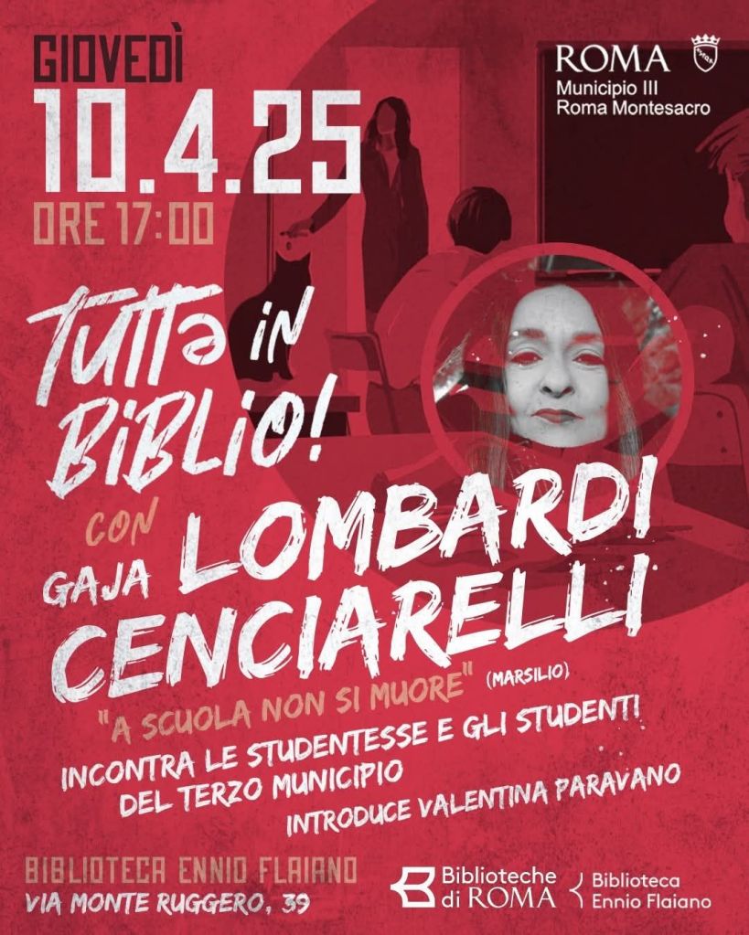 [ROMA] La biblioteca Ennio Flaiano il 10 aprile 2025 ospita la scrittrice Gaja Lombardi Cenciarelli e il suo romanzo “A scuola non si muore” edito da Marsilio. L’autrice dialogherà con le studentesse e gli studenti del Terzo Municipio.