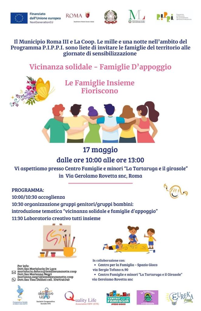 [ROMA] Sabato 17 maggio 2025 dalle 10 alle 13 presso il Centro per la Famiglia “La Tartaruga e il Girasole” in via Gerolamo Rovetta a Talenti si terrà la giornata di sensibilizzazione intitolata “Vicinanza solidale – Famiglie d’appoggio – Le famiglie insieme fioriscono”.