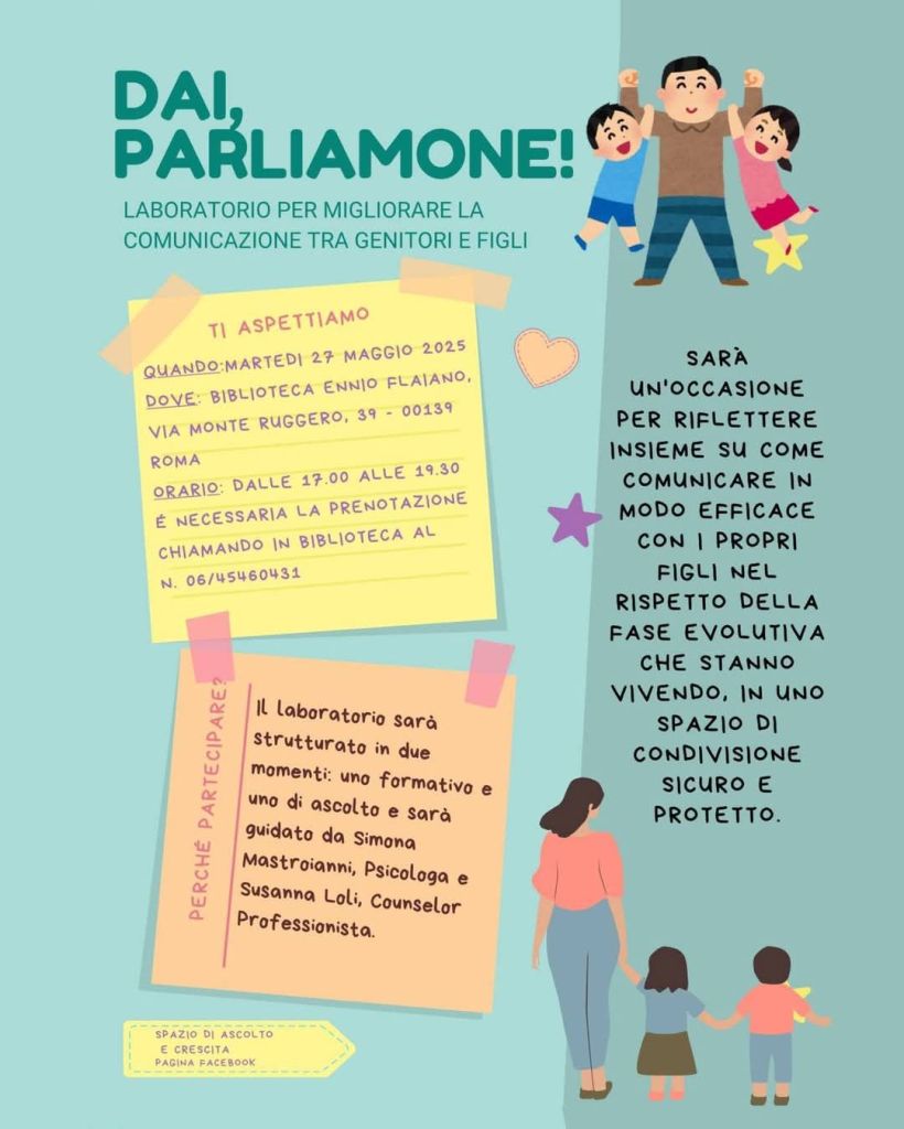 [ROMA] Martedì 27 maggio 2025 alla biblioteca Ennio Flaiano si terrà il laboratorio “𝐃𝐚𝐢, 𝐩𝐚𝐫𝐥𝐢𝐚𝐦𝐨𝐧𝐞!” dedicato ai genitori di ragazze e ragazzi che vogliano imparare a comunicare meglio con i propri figli.