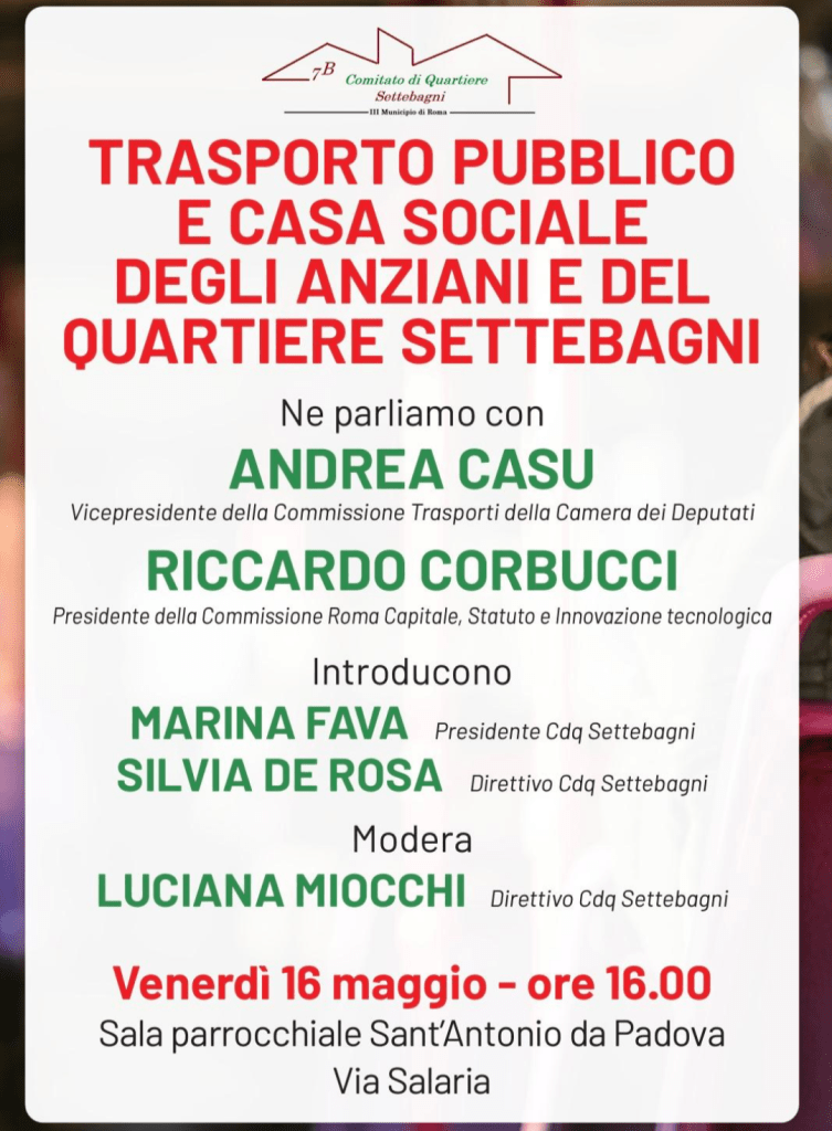 [ROMA] Per venerdì 16 maggio 2025 il Comitato di Quartiere Settebagni ha organizzato una assemblea pubblica sul futuro del trasporto pubblico in zona, sulla prossima realizzazione della Casa Sociale degli Anziani e del Quartiere e sull’abbattimento delle barriere architettoniche della stazione ferroviaria.