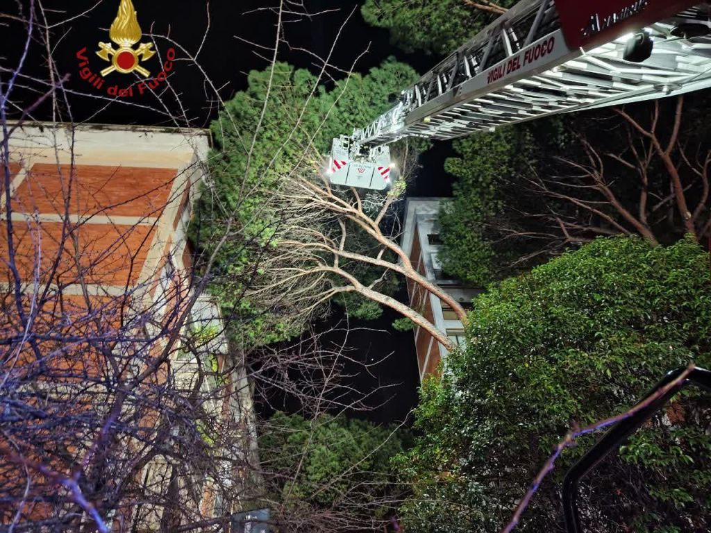 I Vigili del Fuoco con l’ausilio della autoscala hanno tagliato i rami e il tronco per evitare ulteriori danni all’edificio e ai passanti.