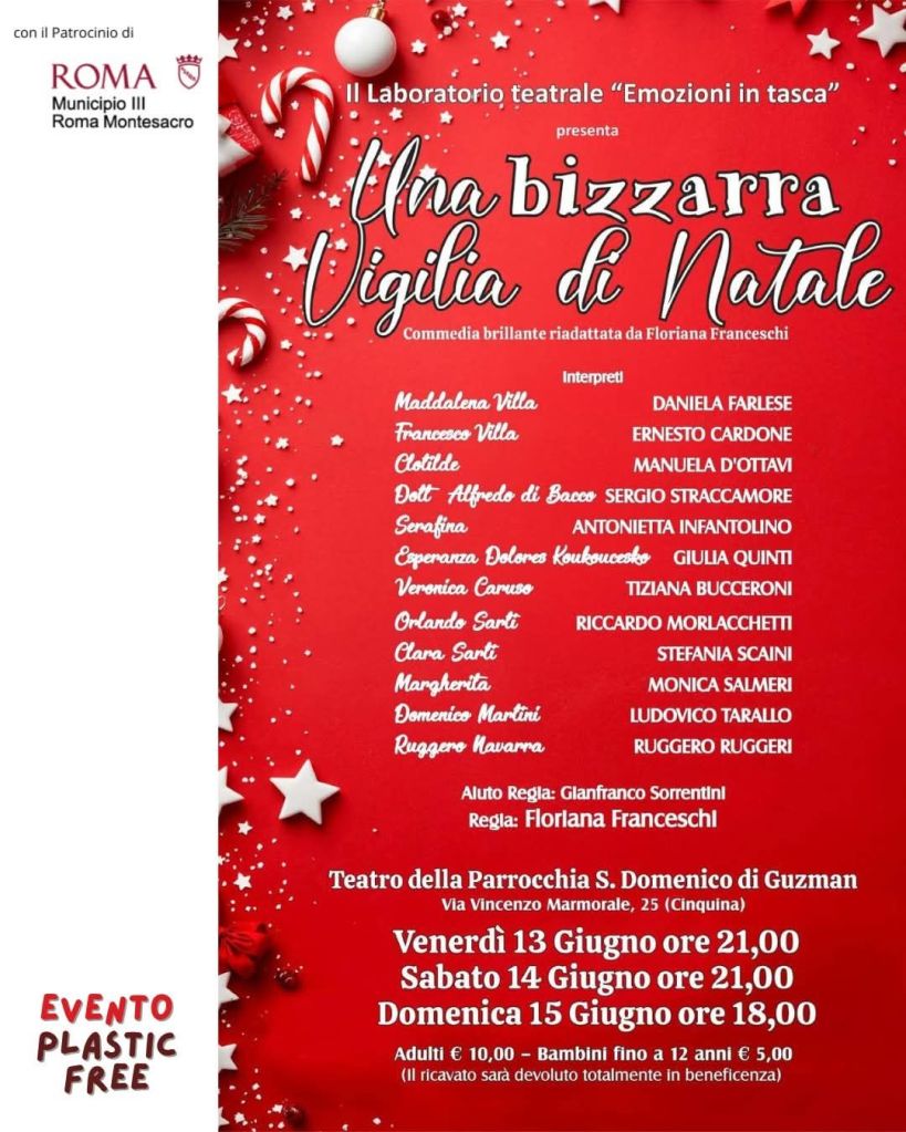 Il 13, 14 e 15 giugno 2025,presso il teatro della parrocchia San Domenico di Guzman, in via Vincenzo Marmorale 25 a Cinquina si terrà lo spettacolo 𝙐𝙣𝙖 𝙗𝙞𝙯𝙯𝙖𝙧𝙧𝙖 𝙫𝙞𝙜𝙞𝙡𝙞𝙖 𝙙𝙞 𝙉𝙖𝙩𝙖𝙡𝙚: è una commedia brillante riadattata e diretta da Floriana Franceschi, a cura del laboratorio teatrale “Emozioni in tasca”.