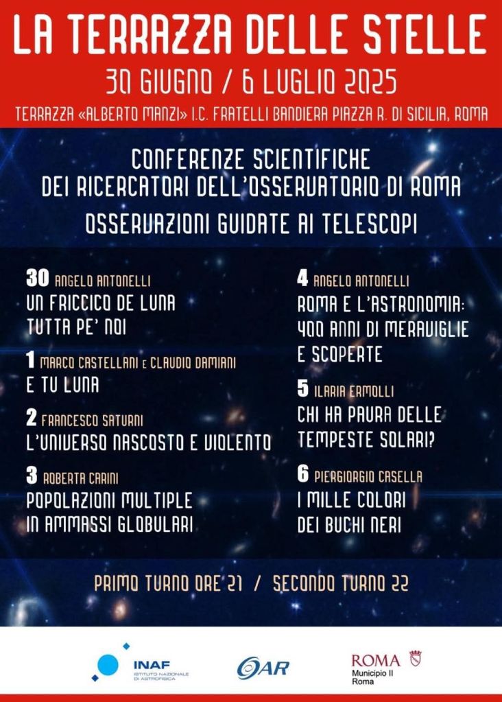 [ROMA] Da lunedì 30 giugno a domenica 6 luglio 2025 la terrazza “Alberto Manzi” dell’Istituto Comprensivo Fratelli Bandiera in Piazza Ruggero Di Sicilia ospita una serie di conferenze scientifiche dei ricercatori dell’Osservatorio di Roma che metteranno a disposizione le proprie conoscenze anche per osservazioni con i telescopi.