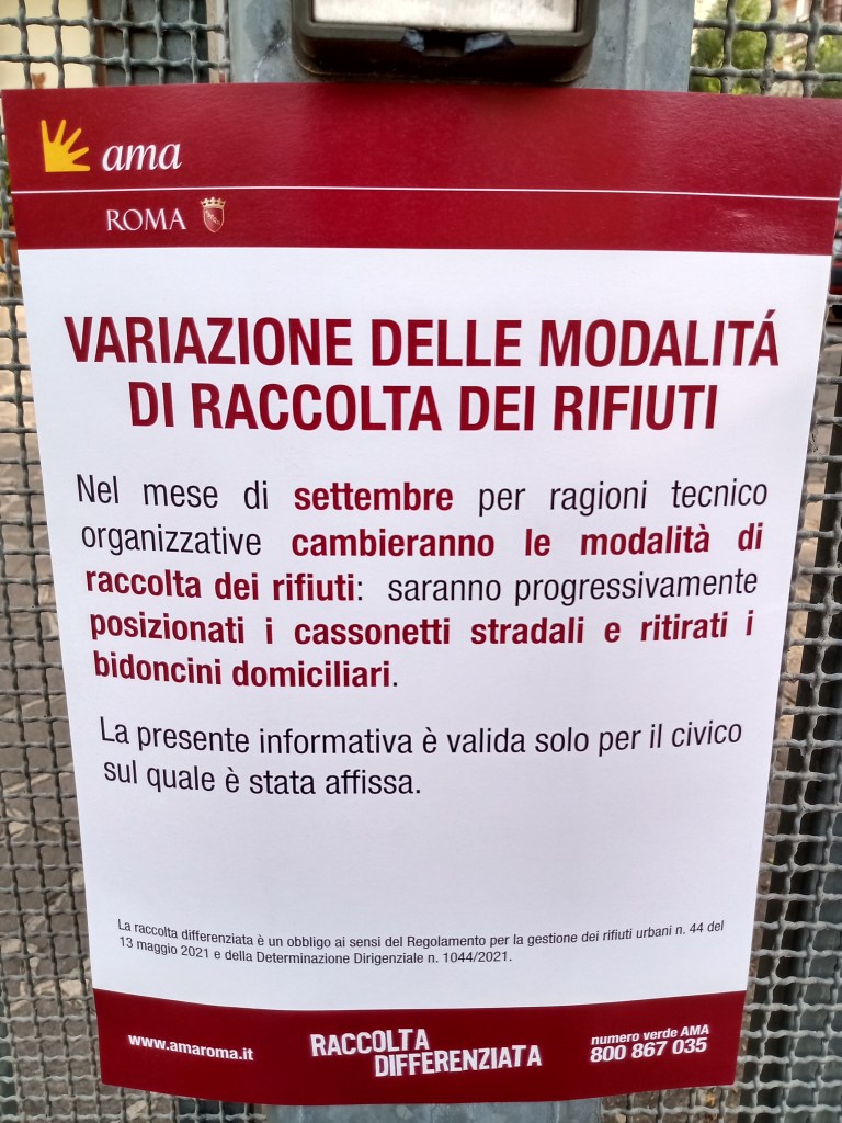 [ROMA] Volantini come quello in foto sono stati affissi ai numeri civici di alcune strade della parte collinare di Settebagni: con essi l’Ama annuncia il ritorno alla raccolta tradizionale della spazzatura con i classici cassonetti stradali anziché con il porta a porta e i bidoncini domestici, introdotti anni addietro.