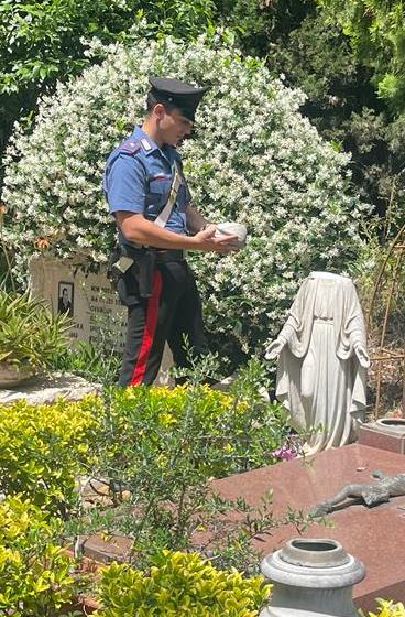 I militari della Stazione di Roma San Lorenzo sono intervenuti su segnalazione della direzione del Cimitero bloccando il giovane straniero nei vialetti del camposanto. Il sopralluogo ha fatto accertare il danneggiamento di complementi di arredo funebre e statue sacre di dodici tombe.
