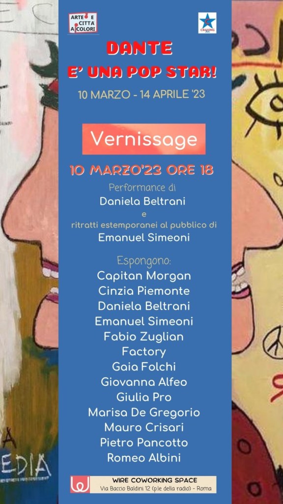 [ROMA] Si inaugura il 10 Marzo 2023 (dalle 18 alle 20.30) presso il Wire Coworking Space in Via Baccio Baldini, 12 (zona Piazzale della Radio), la mostra “Dante è una Popstar”.