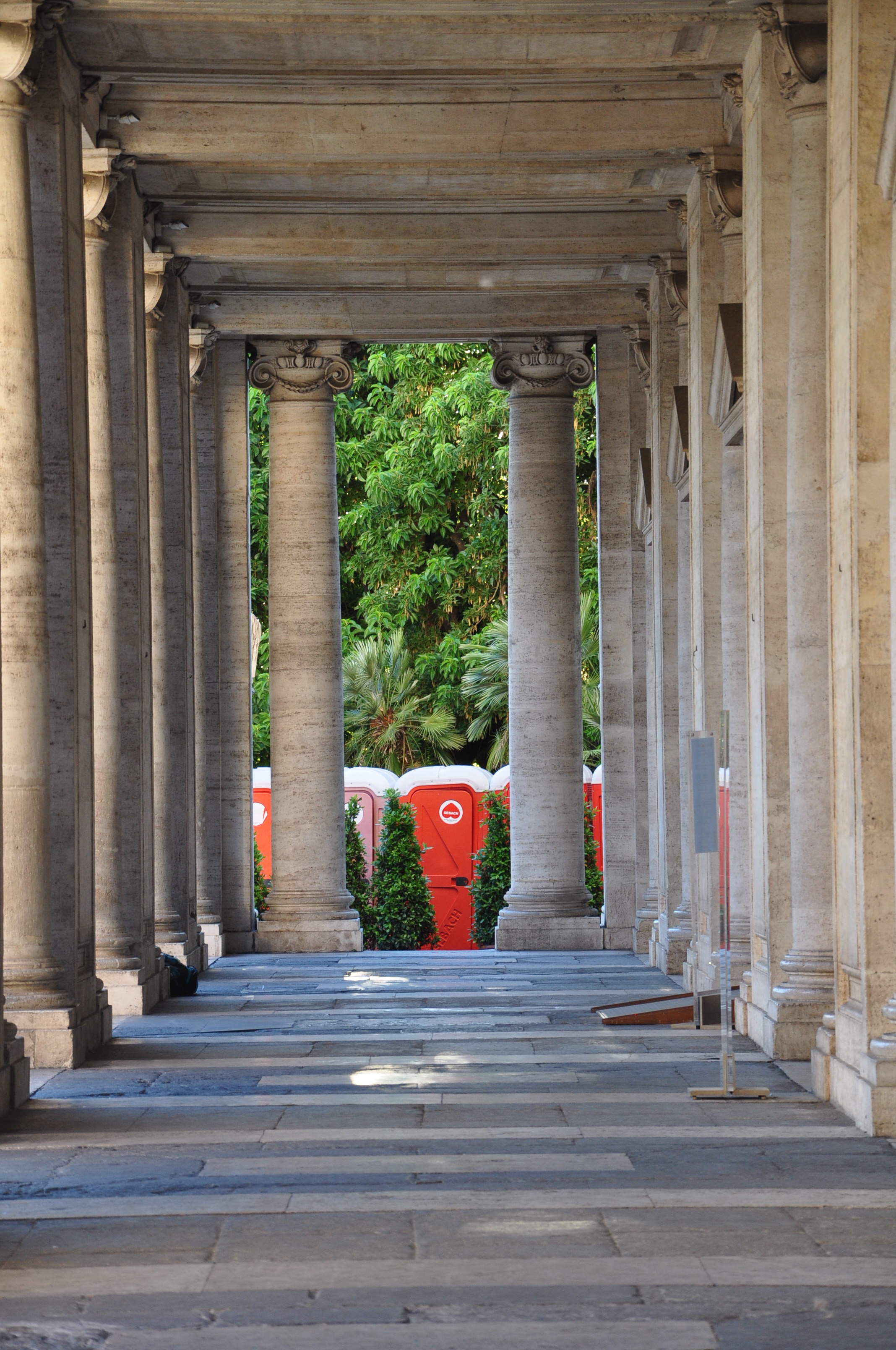 “di tanti giorni per manifestare la solidarietà al Sindaco, gli attivisti vanno a scegliere proprio quello che han meno possibilità di funzionare, uno in cui c’è lo sciopero dei mezzi pubblici. La fascia di garanzia termina proprio quando dobbiamo andare in onda. Vabbè, che non si dica che non sono una tipa adattabile. Qualche problema nel far rimanere le persone che interverranno, mica tutti son votati alla scarpinata, pure se si tratta di difendere il Sindaco o di cogliere l’occasione ghiotta di insolentirlo via etere. In attesa della diretta con la radio mi guardo intorno: una coppia di sposi, lui in alta uniforme, lei con il reggiseno che spunta irriverente dalla scollatura sulla schiena. Sorrido, immaginando che il neo marito per non metterla in imbarazzo gli sta facendo fare il defilè della vita in condizioni quasi comiche, fortuna che i romani ormai sono abituati a tutto…li accompagno con gli occhi fin sotto il colonnato dei musei capitolini e la mia attenzione passa dal vestito della sposa ….alla linea di bagni chimici posizionati alla fine delle colonne. Rossi con un cuore rovesciato gigante e marca ben evidenza. Uao. Sullo sfondo una cascata di edera. Penso che questa la devo fotografare, a raccontarla si rischia di non essere creduti. Vero che quando scappa scappa ma…avrebbero potuto incartarli, mimetizzarli, colorarli di verde, chessò.