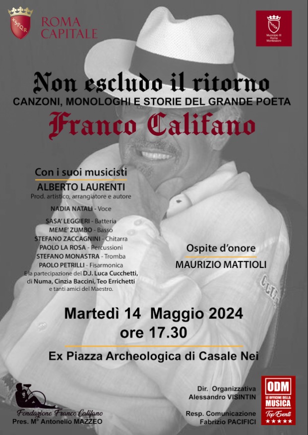Dopo aver già cambiato nome nei giorni scorsi sulla toponomastica dei navigatori gps, la ormai ex piazzetta archeologica di Casale Nei verrà ufficialmente inaugurata martedì 14 Maggio alle ore 17.30 come Piazza Franco Califano. Oltre che con la presenza dell’amministrazione locale, con un concerto-evento il “Non escludo il ritorno – canzoni, monologhi e storie del grande poeta” tenuto dal Maestro Alberto Laurenti e dalla sua band di musicisti e di amici, con la voce di Nadia Natali e con ospite d’onore Maurizio Mattioli. Alla presenza di Antonello Mazzeo, amico e batterista storico del cantautore, depositario della sua eredità morale e presidente della Fondazione Franco Califano.