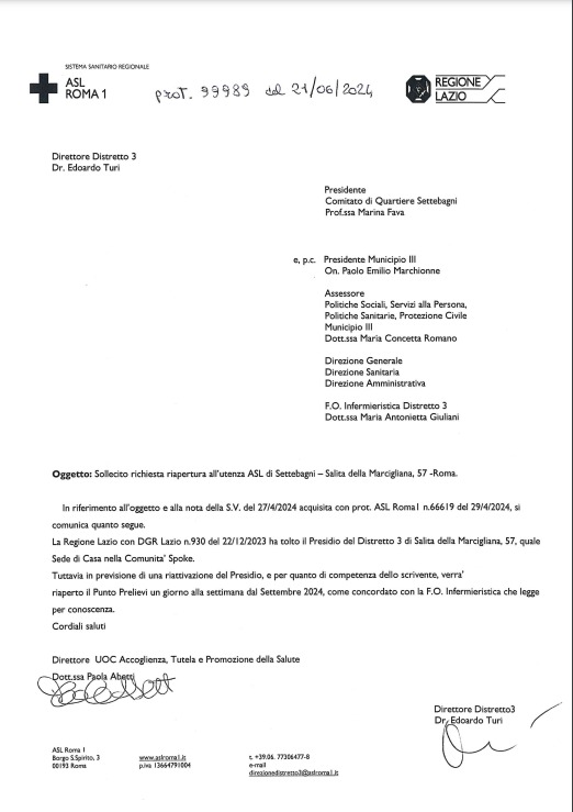 I residenti nel corso degli anni si sono trovati varie volte a difendere l’avamposto sanitario pubblico dai tagli di bilancio e dal cambio di servizi. Presidio di vitale importanza per un quartiere che non ha collegamenti pubblici con il resto dei servizi locali – manca infatti un bus che porti in direzione degli ambulatori della Asl RM1, collocati principalmente in via Dina Galli a Vigne Nuove e a via Lampedusa, zona piazzale Adriatico ma anche con la realizzanda Casa della salute di via paolo Monelli a Bufalotta. Il progetto di una casa della salute, che andasse ad ampliare i servizi offerti nella ex condotta medica – quindi un presidio sanitario pubblico sul posto è presente da sempre – che è anche sede di una postazione di ares 118 giudicata strategica per via della vicinanza con l’autostrada e il Gra – è svanito, a seguito della decisione di ridimensionare il progetto, che allo stato sembrerebbe prevedere solo l’impianto di via Monelli, per altro già in sostituzione del servizio eliminato in via Rovani, dove la Asl era affittuaria. La popolazione di Settebagni era già stata penalizzata all’epoca dell’emergenza Covid, con l’ambulatorio analisi riconvertito fino a fine necessità – a centro per l’effettuazione tamponi Covid, data la posizione isolata rispetto ad altre strutture presenti in situazioni più densamente popolate – e fatta digerire ai residenti con la futura implementazione dei servizi a parziale ristoro per il sacrificio subito.