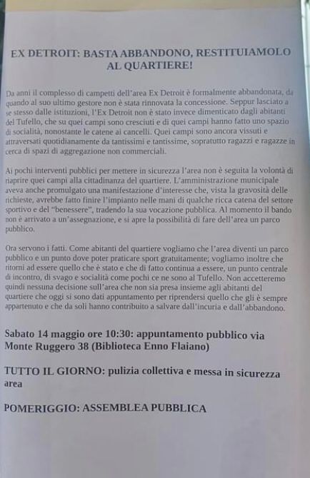 Un gruppo di residenti organizzati occupa il centro sportivo ex Detroit, al Tufello. Rompono i lucchetti, puliscono, cercano di ridare un po’ di decoro a una struttura chiusa da tempo. Attraverso un evento creato su fb da csa Astra viene data notizia di un’assemblea pubblica per sabato 14 maggio.