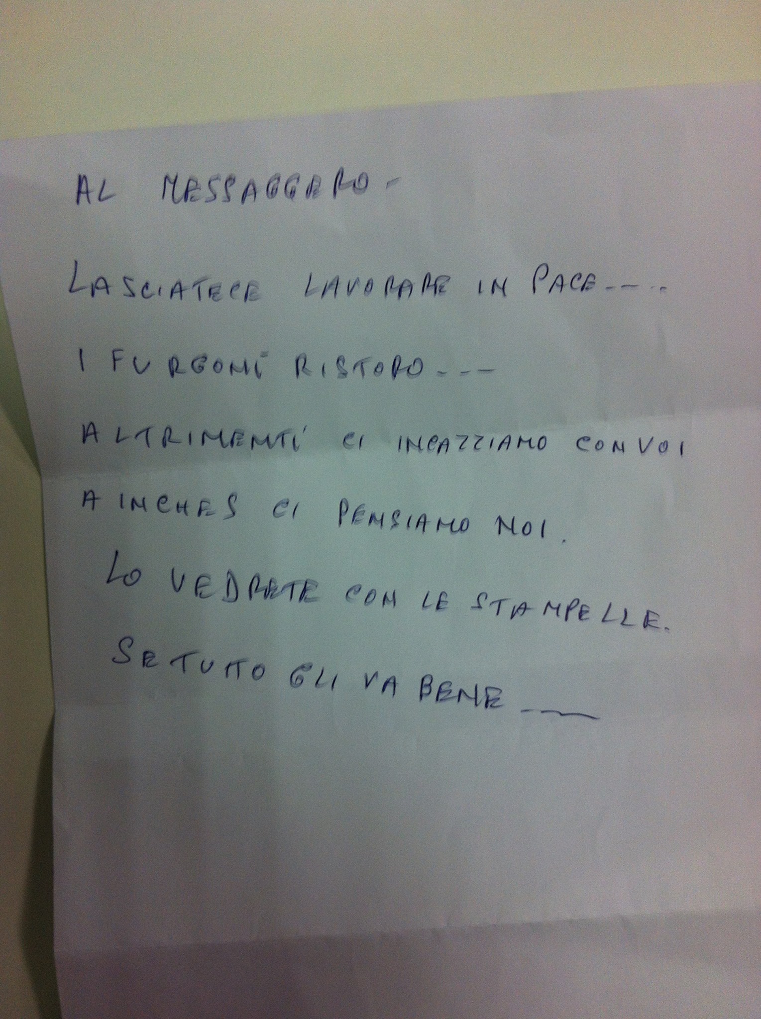 “Lasciatece lavorare in pace….i furgoni ristoro…altrimenti ci incazziamo con voi…A Inches ci pensiamo noi. Lo vedete con le stampelle. Se tutto va bene…’ E’ questo il testo della lettera anonima che ha come destinatari il quotidiano Il Messaggero, il capogruppo alla Camera di Fratelli d’Italia, Giorgia Meloni, e il sottoscritto, in seguito al dossier che ho consegnato alla Procura sulle irregolarità riscontrate nel mio tour di verifica sulle attività dei camion bar dislocate sul territorio della Capitale, di cui si è occupato lo stesso quotidiano. Dopo la consegna di quella documentazione è stato aperto un fascicolo in Procura per approfondire e chiarire i motivi per cui vengano derogate molte delle regole riguardanti i chioschi ambulanti, sfociando nell’illegalità, senza che si intervenga in maniera adeguata e puntuale. Se qualcuno si è sentito in dovere di scrivere queste frasi vigliacche, significa che ho toccato un nervo scoperto, segno che la mia attività si svolge nella giusta direzione. Queste minacce, le ennesime che ricevo, non mi intimoriscono ma, al contrario, rappresentano un ulteriore motivo per continuare a lavorare al fine di garantire la legalità nel territorio capitolino”. Questa è la nota diffusa alle agenzie di informazione daa Massimo Inches, consigliere del II Municipio di Roma Capitale, con il pallino del rispetto dei regolamenti comunali e della legalità.
