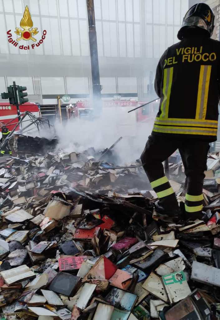 Erano circa le cinque quando le fiamme sono divampate distruggendo la struttura e i volumi in vendita. Sul posto è intervenuta la Squadra 1/A dei Vigili del Fuoco della Sede Centrale con una autobotte.