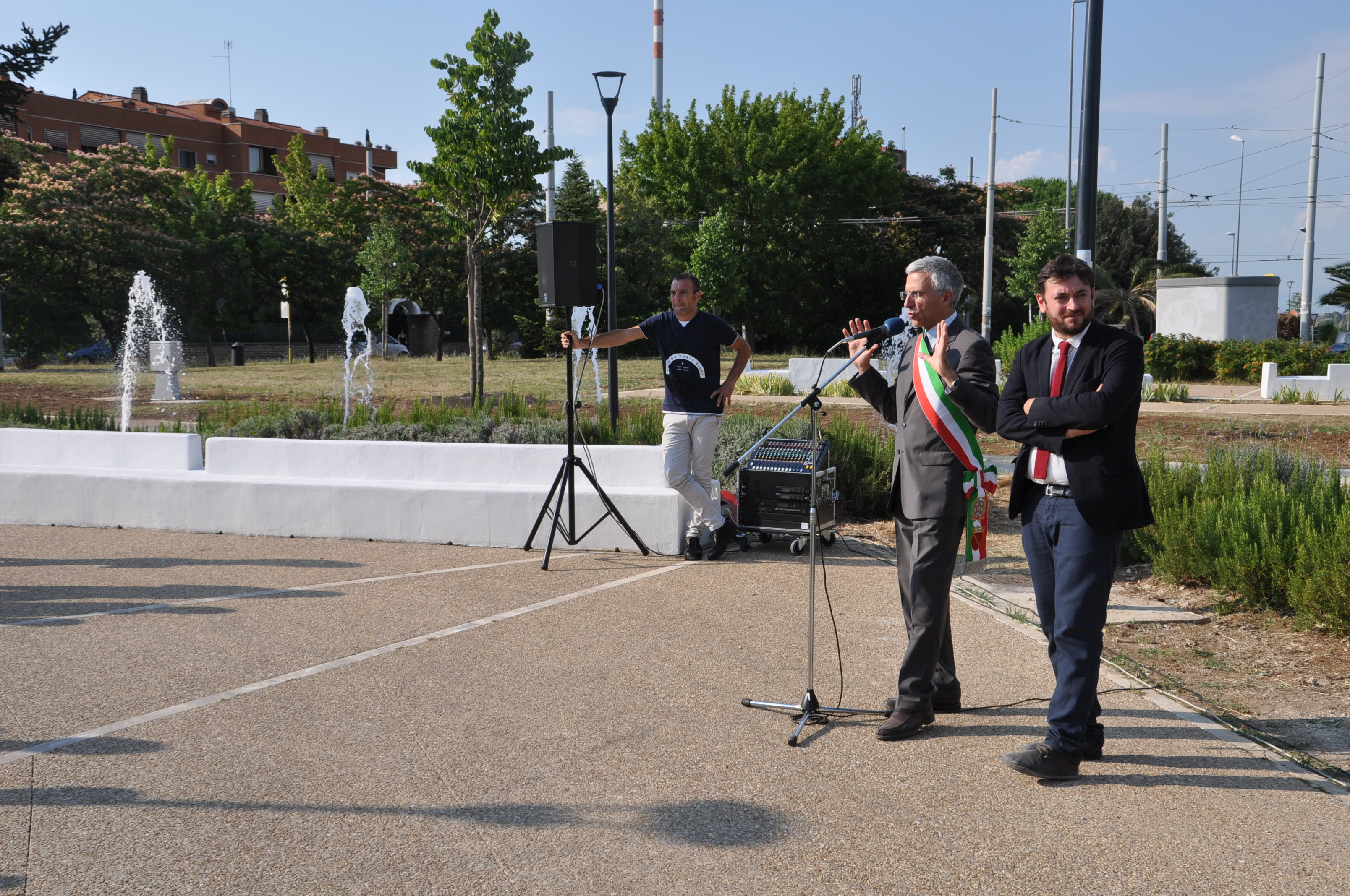 Le fontane a pavimento dietro il vicesindaco Nieri e il presidente del Municipio Marchionne