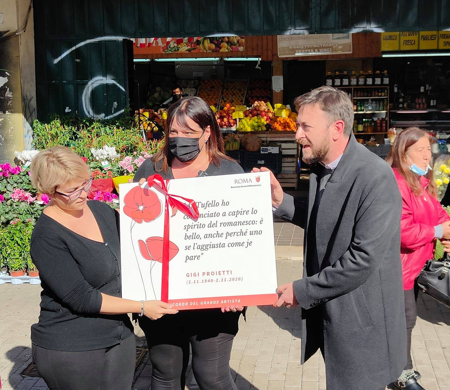 Il mercato di piazza degli Euganei, nel cuore del Tufello era già stato intestato qualche tempo fa a Gigi Proietti. Oggi, nel giorno del primo anniversario della sua scomparsa, una targa ricordo è stata consegnata dal neo presidente del III Municipio, Paolo Marchionne, nelle mani della presidente dell’ags Alessandra Ranzani e dell’operatrice del mercato Simona Maiello, in rappresentanza di tutti gli esercenti.
