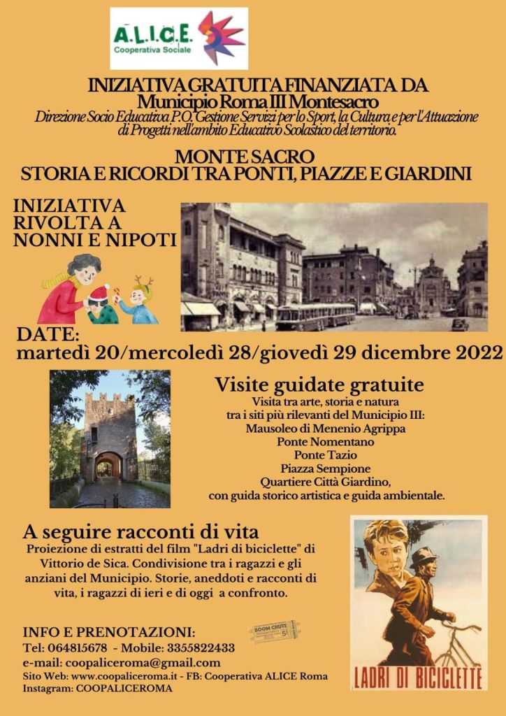 Si prosegue il 20, 27 e 28 dicembre con una serie di iniziative per nonni e nipoti durante le vacanze di Natale: con un bando municipale la Cooperativa Sociale A.L.I.C.E. offre gratuitamente visite guidate (con guide storico artistiche e ambientali) dal titolo “Montesacro storia e ricordi fra ponti, piazze e giardini”. Verranno illustrati tutti i luoghi di rilievo di Città Giardino, dai reperti romani e medievali fino al ‘900. Inoltre in collaborazione con i Centri Sociali Anziani del Terzo municipio verrà proiettato Ladri di Biciclette di Vittorio De Sica per riscoprire insieme la Roma dei nonni.