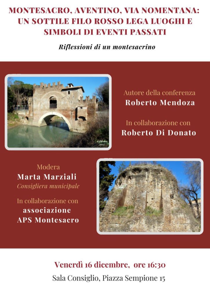 Si inizia il 16 dicembre nell’aula consiliare a piazza Sempione con lo studioso di storia e latinista Roberto Mendoza (montesacrino doc) che terrà una lezione su Monte Sacro che sarà un po’ come un viaggio virtuale sulla via Nomentana. L’incontro sarà moderato dalla consigliera Marta Marziali e sarà presente l’associazione Aps Montesacro che negli anni scorsi ha curato la pulizia della targa dedicata a Simon Bolivar. L’inizio è previsto per le 16 e 30.