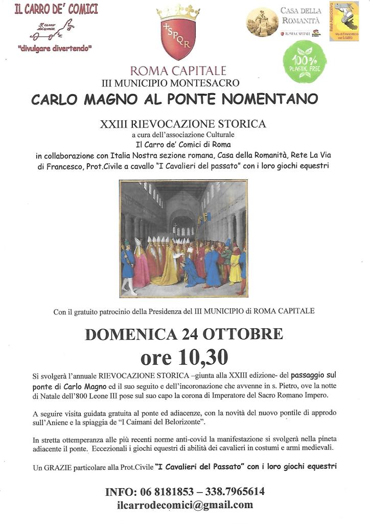 [ROMA] Si è svolta lo scorso 24 ottobre l’annuale rievocazione in costume del passaggio di Carlo Magno al Ponte Nomentano di Monte Sacro e dell’incontro con il Papa Leone III- avvenuto nell’anno 800- curata dall’associazione “Il Carro de’Comici” e giunta alla ventitreesima edizione.