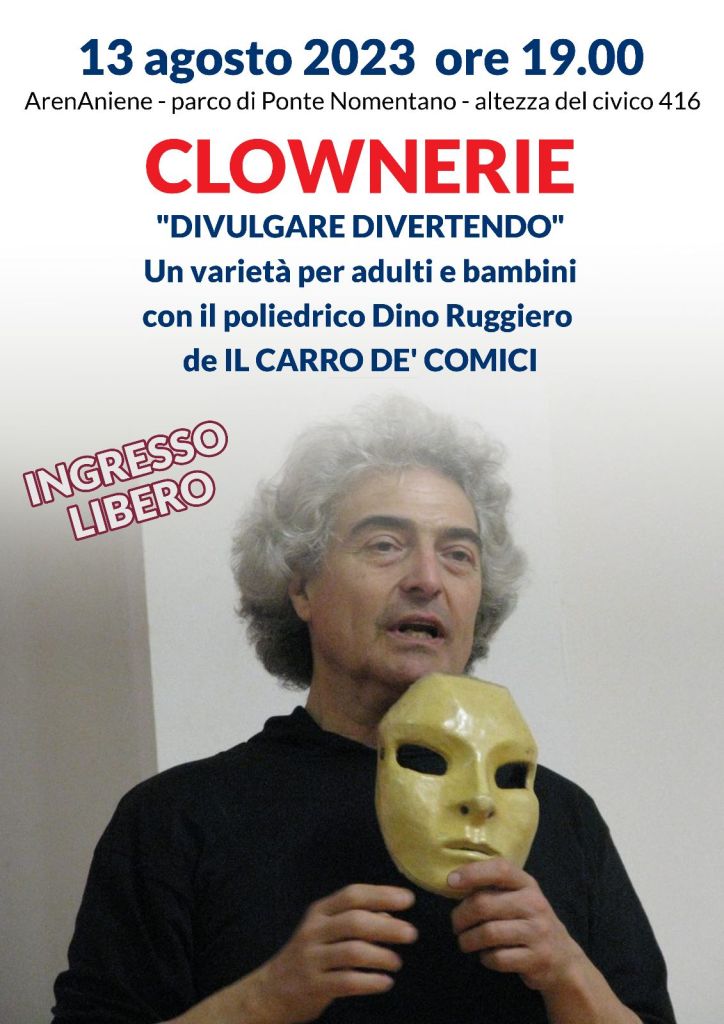 [ROMA] All’ArenAniene presso il parco di Ponte Nomentano domenica 13 agosto va in scena Clownerie, varietà per adulti e bambini con il poliedrico attore e regista Dino Ruggiero de Il Carro de’ Comici.