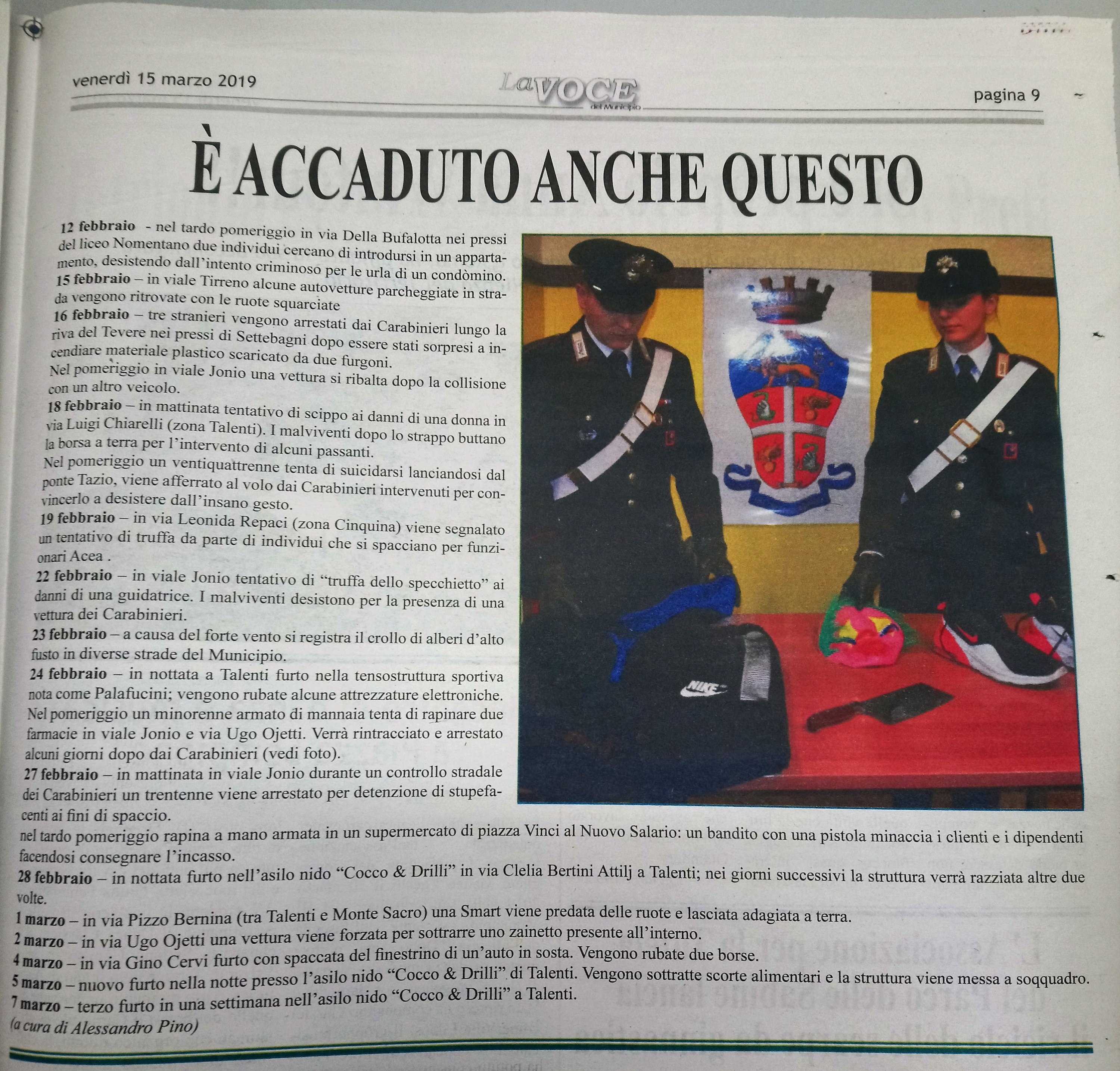 [Roma] Lascia sempre più sgomenti l’indecente elenco di reati legati alla cosiddetta microcriminalità – termine riduttivo perché è quella che maggiormente mina il senso di appartenenza a una comunità – commessi nelle strade del Terzo Municipio: furti in appartamento, scippi, rapine a mano armata in esercizi commerciali con i clienti minacciati, truffe di ogni tipo che colpiscono specialmente gli anziani – vedasi quelle dello specchietto o del contatore – automobili spolpate di ruote e altri componenti, fino alla beffa della tragicomica sequenza di incursioni notturne in un asilo di Talenti dove puntualmente viene fatta razzia di generi alimentari. Al riguardo ha dato il suo autorevole parere il Luogotenente in congedo Salvatore Veltri, per ventotto anni al comando della Stazione Carabinieri Talenti: «Il legislatore, che viaggia con scorta e mezzi privati e ha sempre chi gli risolve i problemi, legifera in maniera tale da non mandare più in carcere nessuno, forse nel timore di incappare in quella rete. La gravità di un fatto va valutata in relazione allo stato sociale della vittima, rubare una vecchia auto a chi non può permettersi il lusso di cambiarla comporta un grave danno». Ai cittadini preoccupati il dottor Veltri dà un semplice e pratico consiglio: «Inviterei tutti a dare maggiore collaborazione alle Forze dell’Ordine, segnalando tutti quei movimenti o personaggi che possono apparire o si notano in un contesto. Una macchina che viaggia a velocità ridotta con persone a bordo che osservano le finestre dei piani; il tizio o la tizia fermi magari con un cellulare in mano che si guardano attorno in continuazione potrebbero essere il “palo” mentre i complici dentro stanno rubando; chiedere a persone estranee che entrano in un palazzo dove vanno e chi cercano, tenendo presente che è meglio chiamare il 112 segnalando l’anomalia. Saranno gli operatori di polizia ad accertare e comunque la presenza di una pattuglia in transito è di per sé un deterrente».