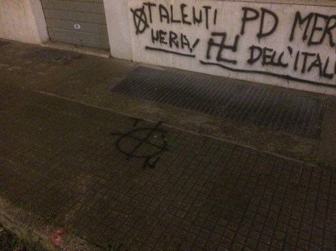 Nella prima serata del 27 maggio mani ignote hanno imbrattato la sede del circolo del Perito democratico di via Giovanni Verga, a Talenti. Insulti, svastiche, croci celtiche e fasci stilizzato, una scritta Dux e una firma “i camerati”. Intorno a una delle croci celtiche, la sigla T N , che potrebbe forse leggersi come “Talenti Nera”, già apparsa in altri luoghi del territorio ma al momento nulla sembra riconducibile all’appartenenza a qualche gruppo organizzato .