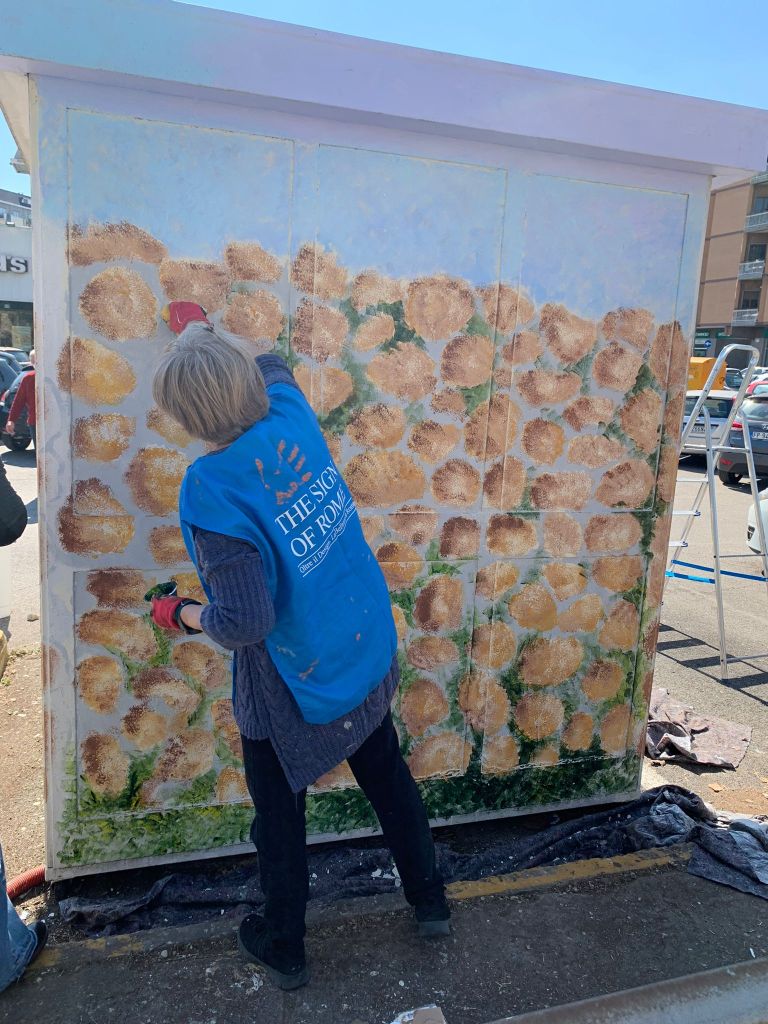 Tutti insieme hanno ripulito il gabbiotto dismesso che si trova all’ingresso del parcheggio di Upim, Carrefour e Mc Donald’s su via Dei Prati Fiscali. Inoltre il lato fronte strada del manufatto è stato decorato con un murale a effetto trompe l’oeil dell’artista Letizia Fortunato.